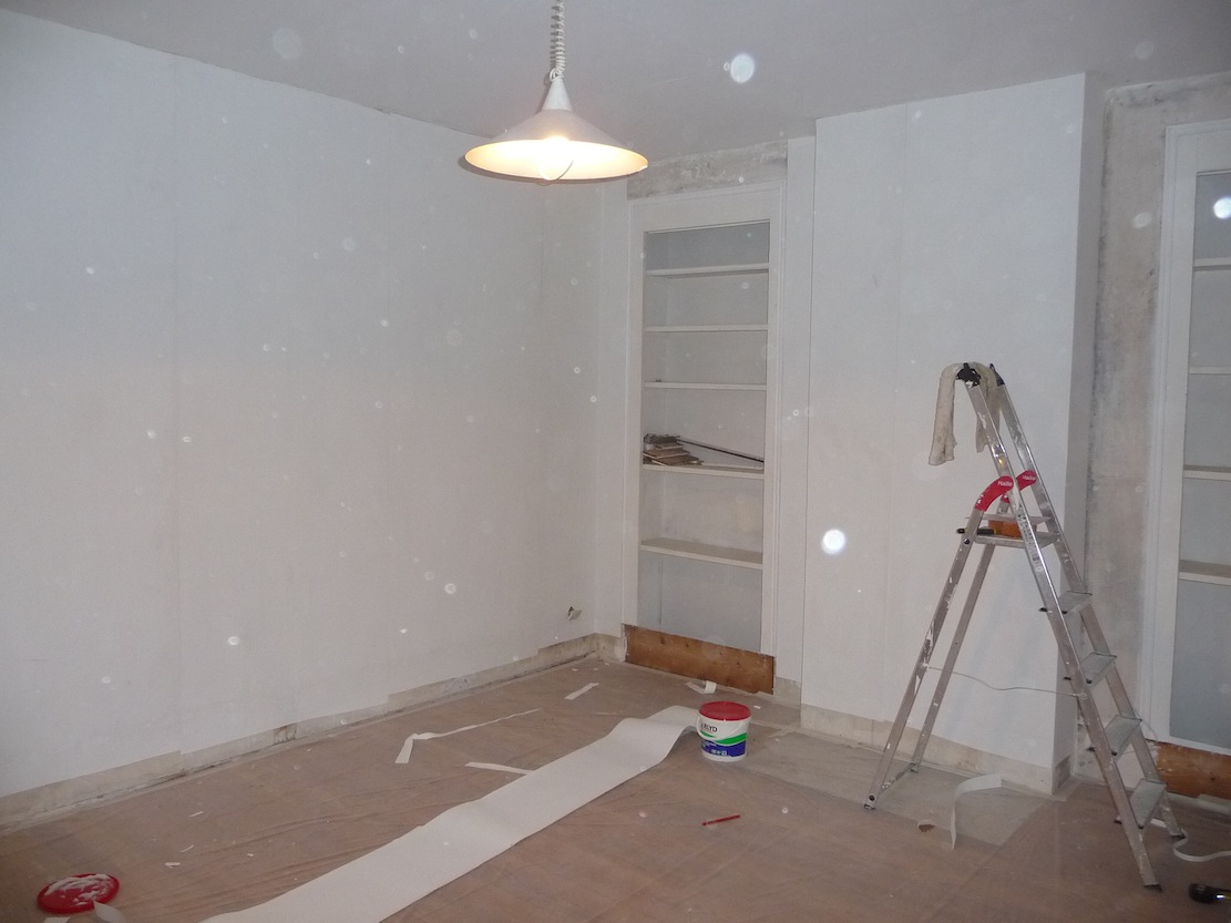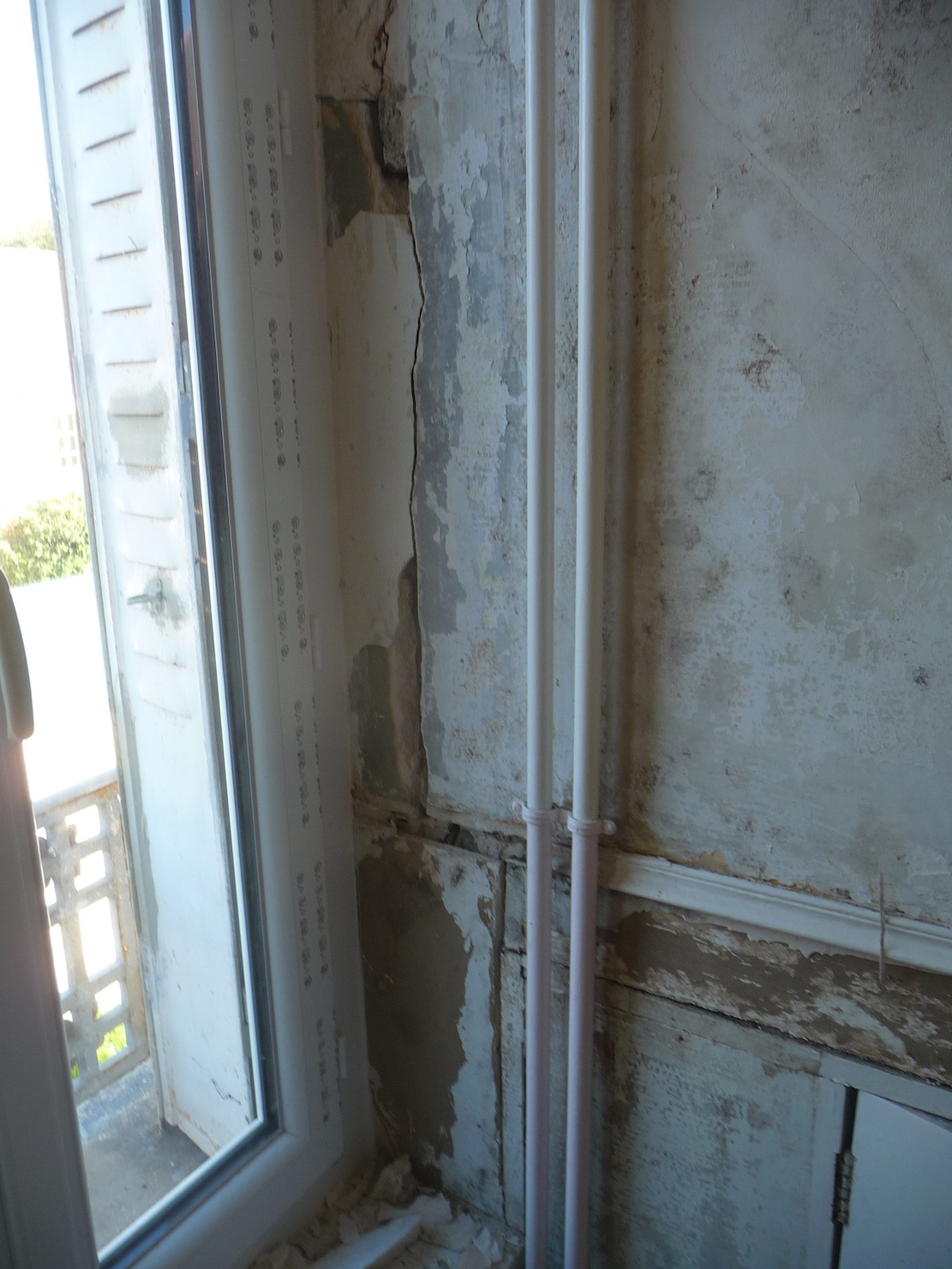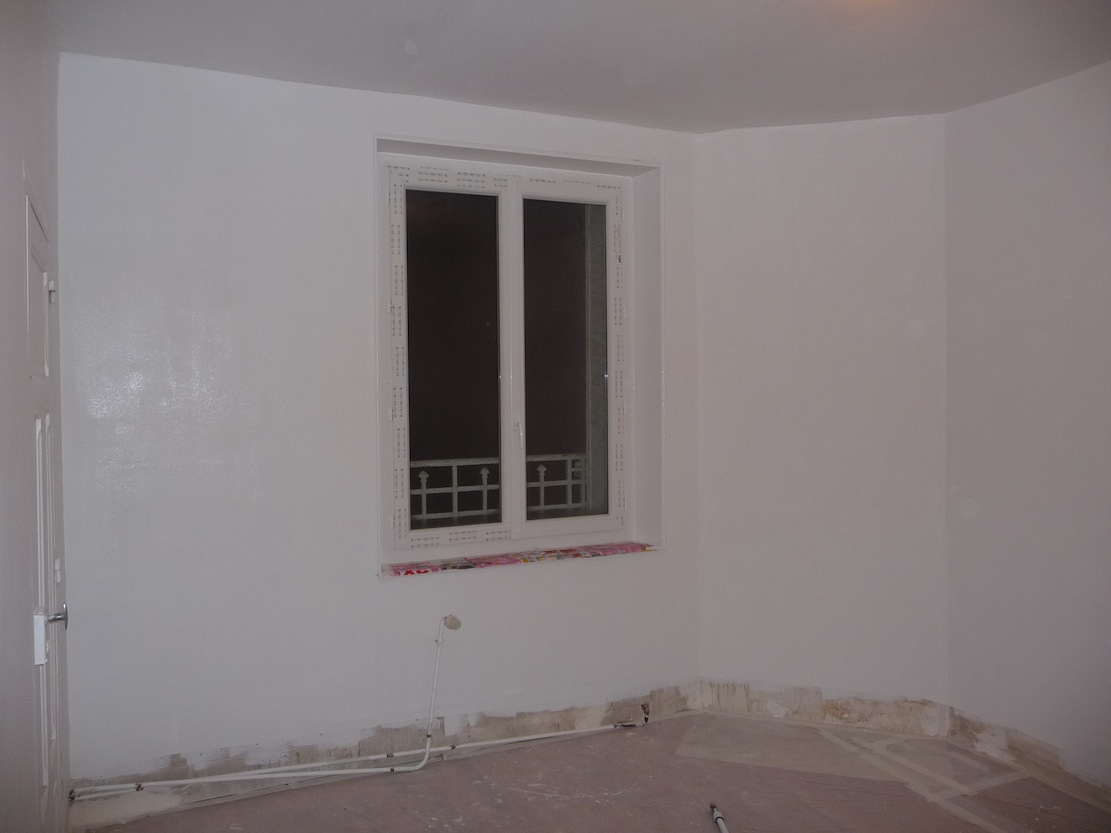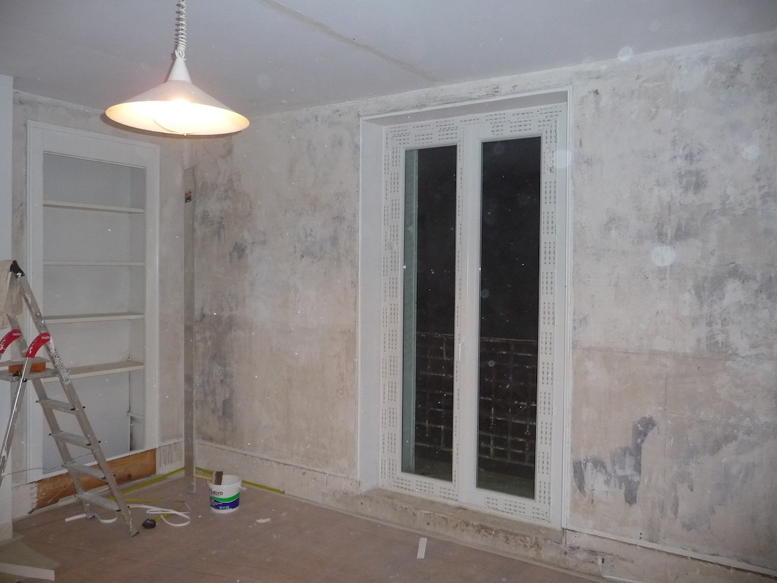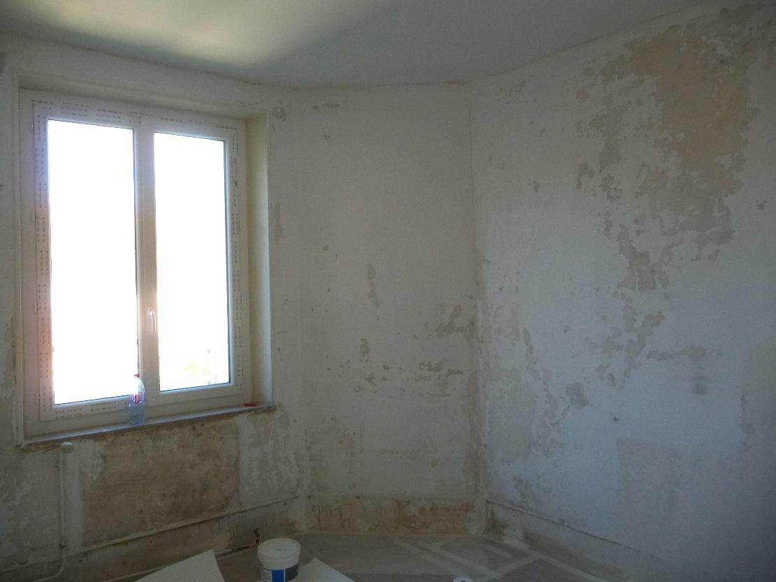 La chambre d'Iris est elle aussi bien avancée, voici l'état des murs avant le support à neuf (mais après décapage grossier et enduit de rebouchage):