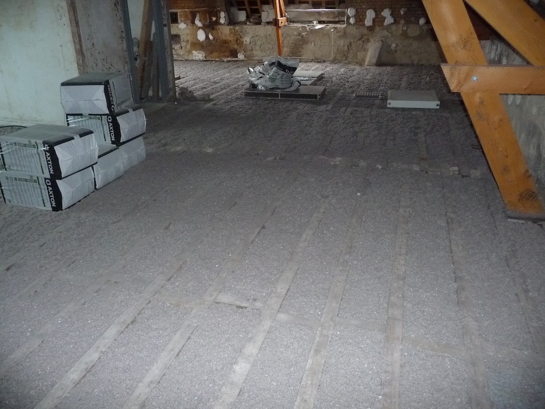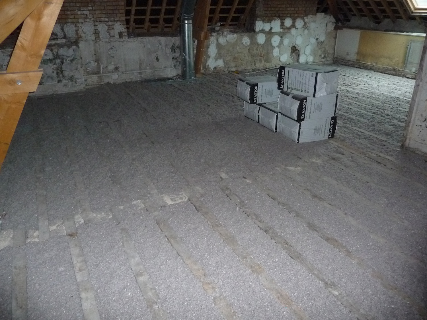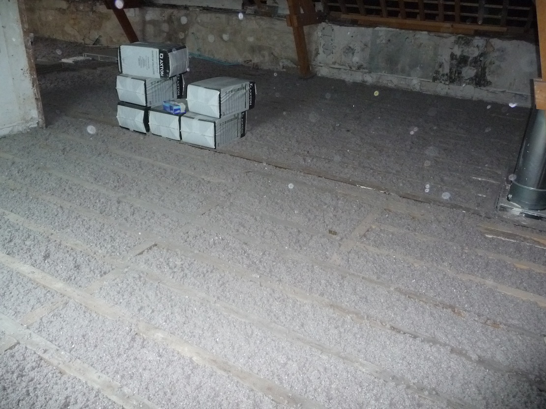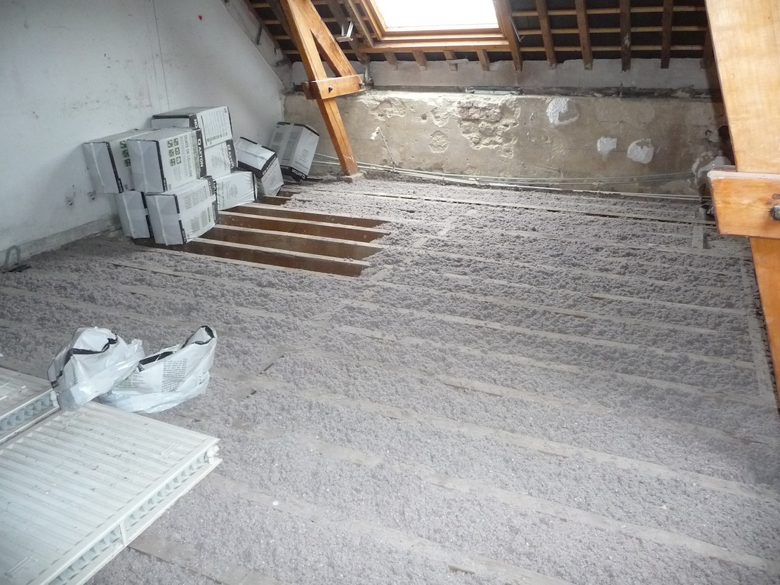 Le gros chantier de la semaine a été le déblayage et isolation du grenier par de la ouate de cellulose. (de 23 à 35 cm d'épaisseur suivant les pièces)