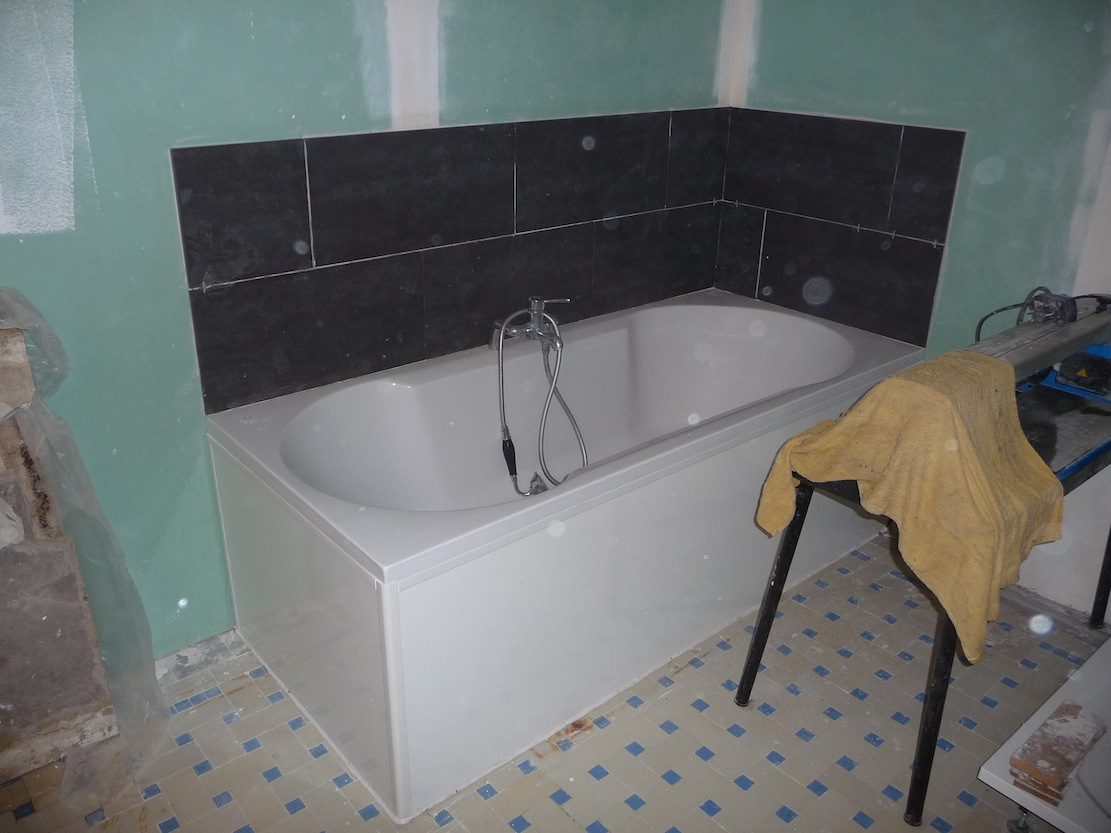 Dans la semaine mon père est aussi passé nous filer un coup de main et a notament terminé le carrelage de la baignoire, ne reste plus que les joints à faire