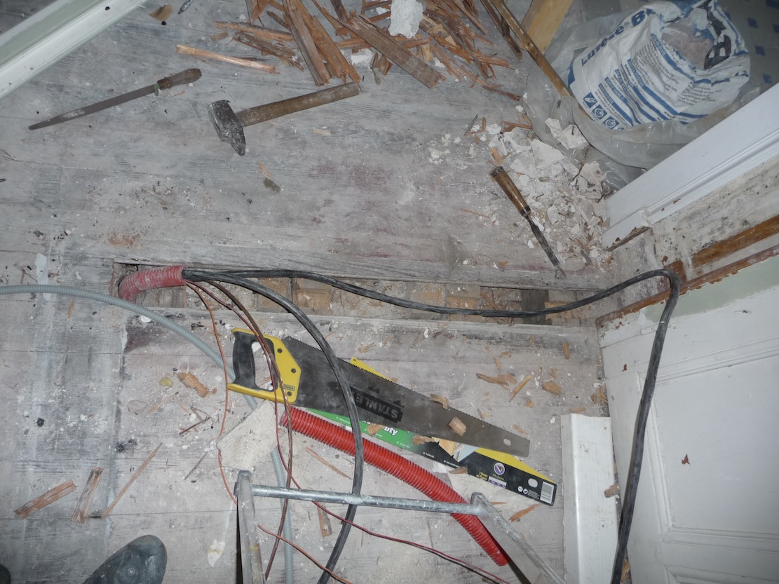 Le conduit est démonté, la latte de parquet aussi, et les poutres du dessous légèrement taillées pour faire passer les cables d'alimentation de l'étage. Il faut finir de faire passer le restant des cables, remonter le conduit sur le mur dans l'angle de la porte du grenier, et remettre un lame de parquet (comme on démonte tout le parquet du grenier, on devrait y trouver notre bonheur)